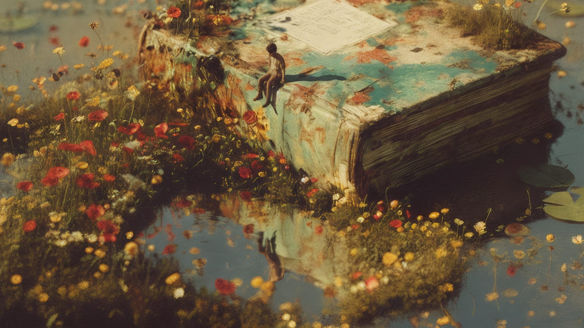 A weathered book rests half-submerged in a tranquil pond, surrounded by wildflowers and tiny patches of moss. Two miniature figures sit on its edge, lost in thought as sunlight glimmers across the water. The scene feels like a dream suspended between memory and imagination - a quiet world where stories bloom again from forgotten pages.
